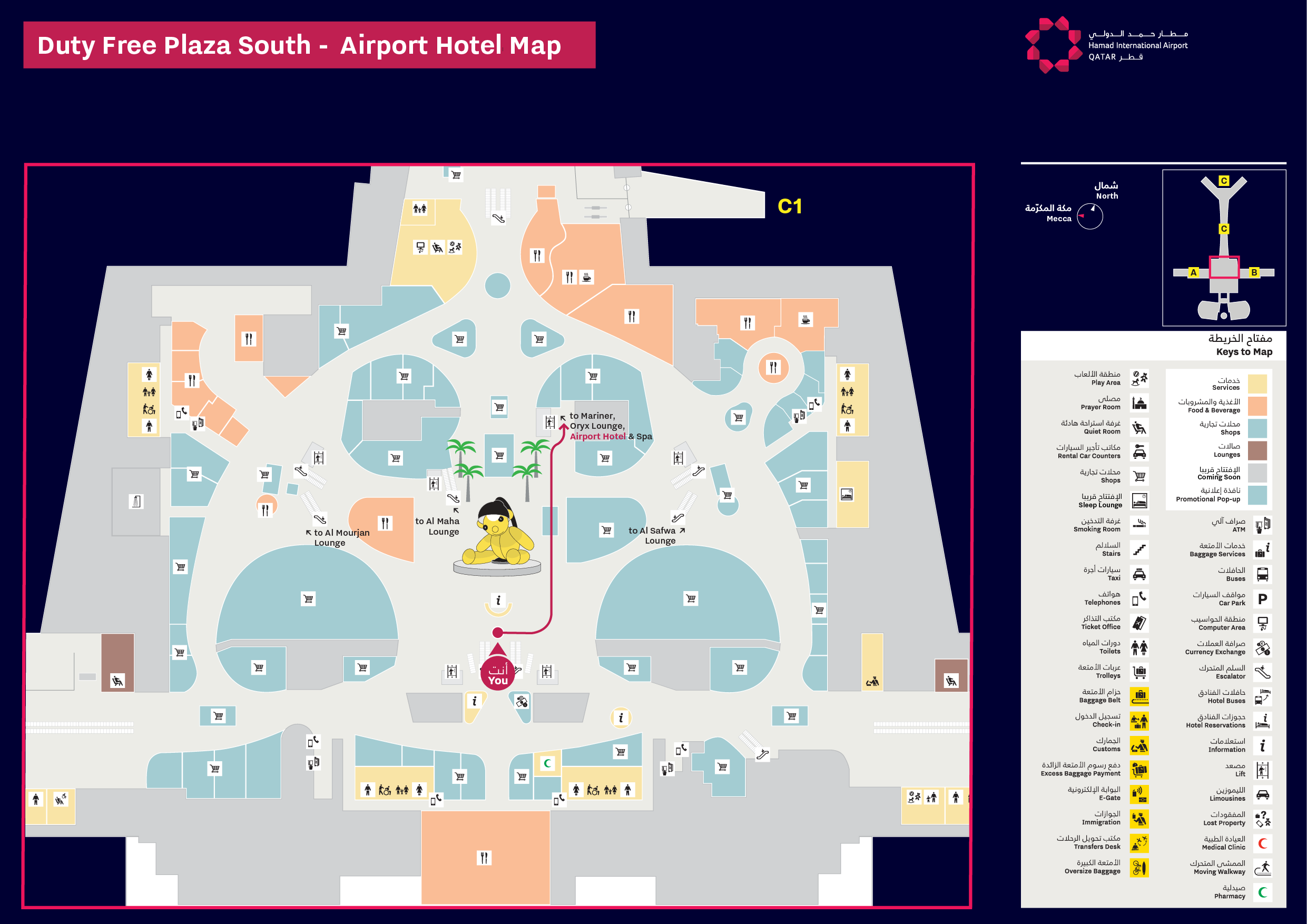 Locate on map Oryx Airport Hotel CONCOURSE B Category Oryx Airport Hotel Discover Oryx Airport Hotel: where luxury meets convenience Book your stay at Oryx Airport Hotel today and experience the unparalleled luxury and convenience within Hamad International Airport.Welcome to Oryx Airport HotelOryx Airport Hotel is the world’s first airport hotel located directly inside the transit area of Hamad International Airport, centrally situated at the South Plaza, next to the famous Lamp Bear.Please click on the following link to view the location map at the Airport: locationElegant AccommodationsThe Oryx Airport Hotel features 100 elegantly designed rooms across six types to meet various needs, whether you're looking for a brief rest or a more extended stay. Our prime location ensures that you can easily access the hotel without leaving the terminal, making your journey smoother and more enjoyable.Sustainable LuxuryWe are committed to sustainability with our eco-friendly amenities and a policy to eliminate single-use plastics. Enjoy a stay that not only pampers you but also supports a greener future.Premium Features24/7 Room Service: Available around the clock to cater to your needs.First-Class Amenities: Experience high-quality linens and exceptional service.Luxury Experience: Our dedicated staff carefully manages every detail, from luxurious linens to exceptional service, ensuring that each guest feels truly pampered. We go the extra mile to celebrate special occasions such as birthdays and anniversaries, making your stay unforgettable.Personalized Service: We collect flight details in advance for a smooth, 24-hour check-in/check-out experience, and ensure rooms are ready and tailored to guest preferences upon arrival.Vitality Wellbeing and Fitness CentreComplimentary Access: All guests of the Oryx Airport Hotel enjoy complimentary access to the award-winning Vitality Wellbeing and Fitness Centre, which includes a modern gym, a 25-meter swimming pool with airport views, a squash court, and comprehensive spa services.Opening Hours: Daily from 06:00 AM to 02:00 AM.Book Nowfor an unparalleled blend of luxury and convenience or visit our website for more information. Oryx Airport Hotel — where luxury meets convenience